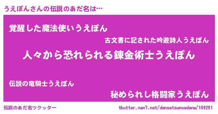 | 女子向けラノベタイトル風あだ名 | 『うえぽんが死なない童話 林檎のうえぽんの診療簿』 |