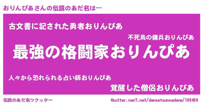 | 男性向けラノベタイトル風あだ名 | 『うちのおりんぴあが世界を掌握している!』 |