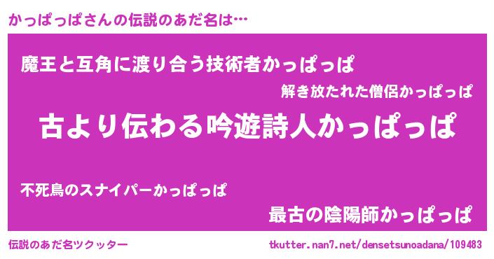 | 男性向けラノベタイトル風あだ名 | 『かっぱっぱという概念が存在しない退屈な世界 』 |