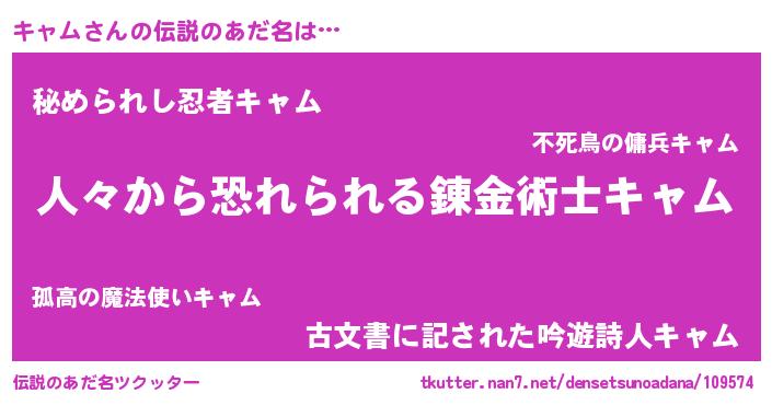 | 男性向けラノベタイトル風あだ名 | 『魔弾の王とキャム』 |