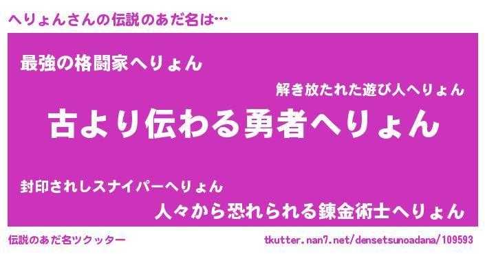 | 男性向けラノベタイトル風あだ名 | 『へりょんという概念が存在しない退屈な世界 』 |
