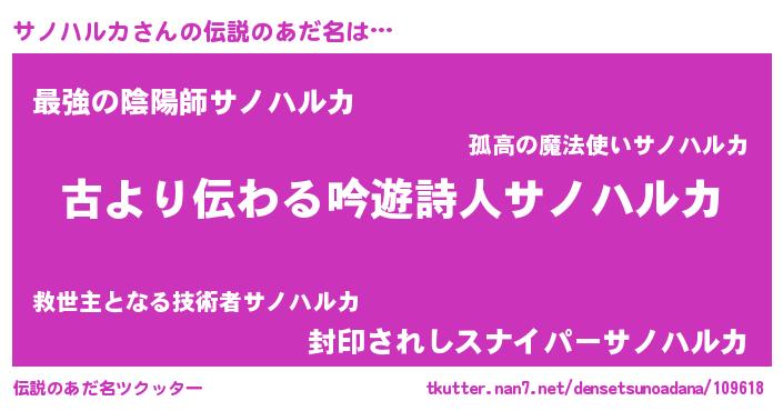 | ヘコむあだ名 | 『サノハルカ(小並感)』『酢こんぶ』 |