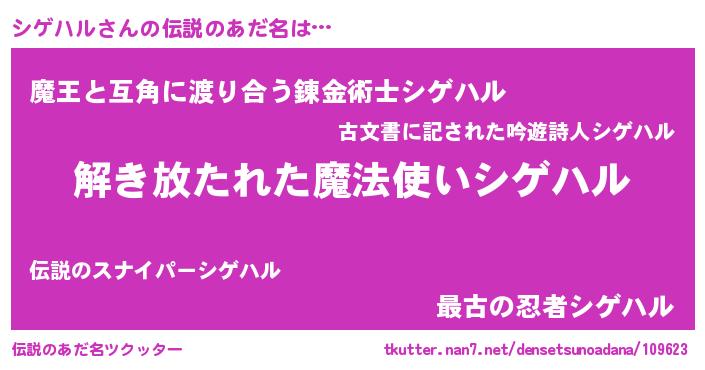 | ヒーロー風カッコイイあだ名 | 『最強戦士シゲハル』『銀牙騎士シゲ』 |