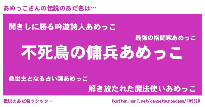 | 男性向けラノベタイトル風あだ名 | 『魔弾の王とあめっこ』『あめっこの憂鬱』 |
