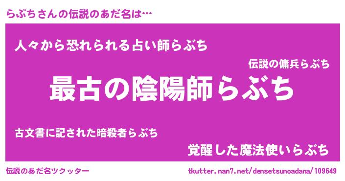 | 女子向けラノベタイトル風あだ名 | 『らぶち伯爵の花嫁』『らぶち恋絵巻』 |