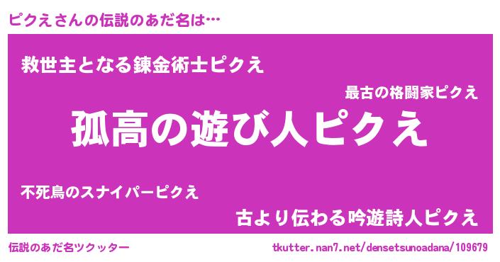 | 男性向けラノベタイトル風あだ名 | 『魔弾の王とピクえ』 |