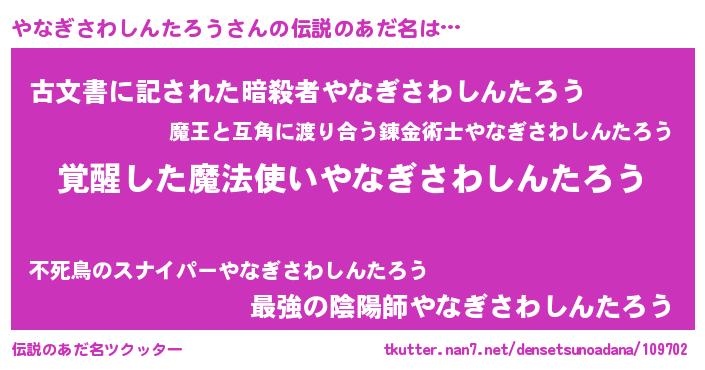 | 男性向けラノベタイトル風あだ名 | 『やなぎさわしんたろうの嫁は女の子じゃないと思った?』 |