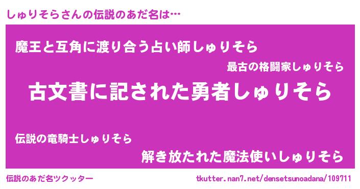 | ヒーロー風カッコイイあだ名 | 『ネオシュリソラ』『最強戦士シュリソラ』 |