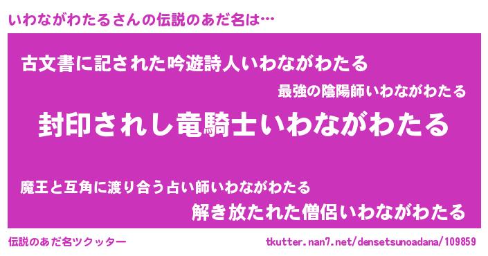 | 男性向けラノベタイトル風あだ名 | 『イワナガワタルアートオンライン』 |