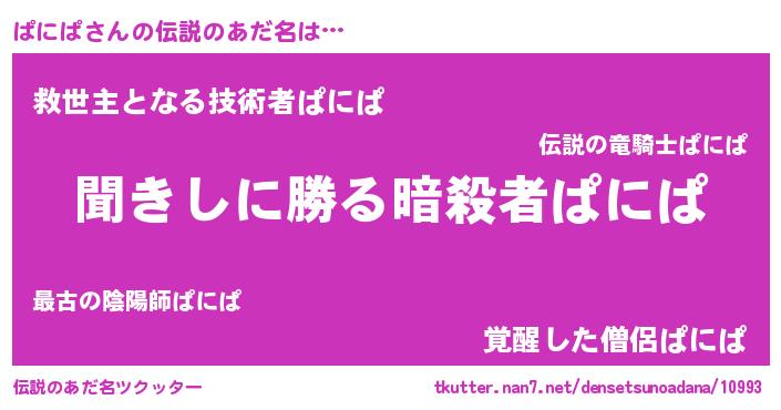 | 男性向けラノベタイトル風あだ名 | 『ぱにぱという概念が存在しない退屈な世界 』 |