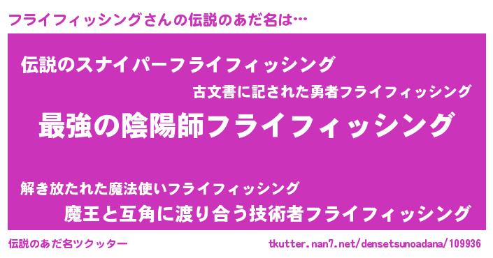 | 男性向けラノベタイトル風あだ名 | 『フライフィッシング~年齢イコール彼女いない歴の魔法使い~』 |