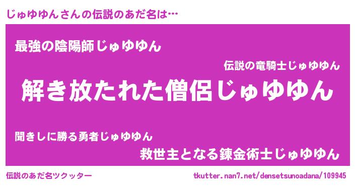 | ヒーロー風カッコイイあだ名 | 『銀牙騎士ジュ』『天空の使者じゅゆゆん』 |