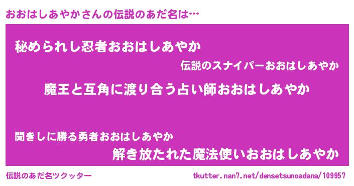 | 男性向けラノベタイトル風あだ名 | 『おまえをオタクにしてやるから、俺をおおはしあやかにしてくれ! 』 |