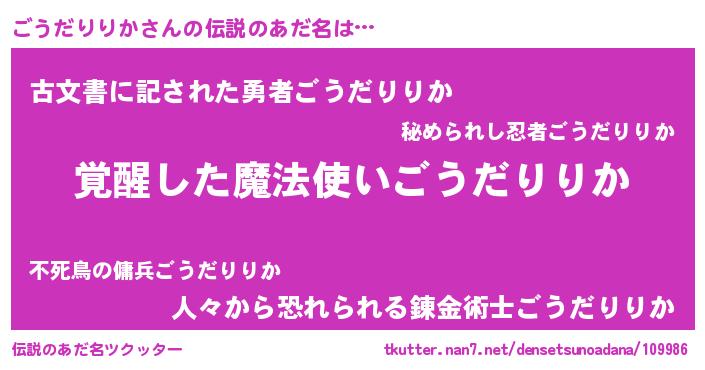 | 男性向けラノベタイトル風あだ名 | 『ごうだりりかの嫁は女の子じゃないと思った?』 |