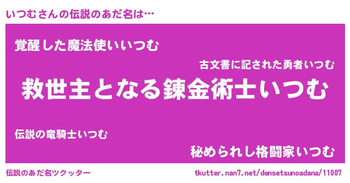 | 男性向けラノベタイトル風あだ名 | 『この素晴らしい世界にいつむを!』 |
