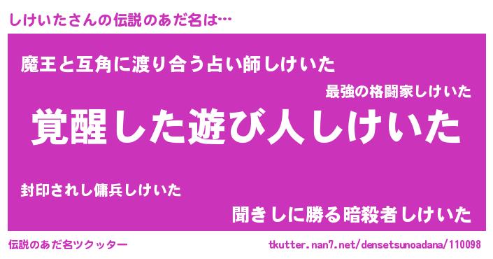 | ヒーロー風カッコイイあだ名 | 『天弓騎士シケ』『愛の使者しけいた』 |