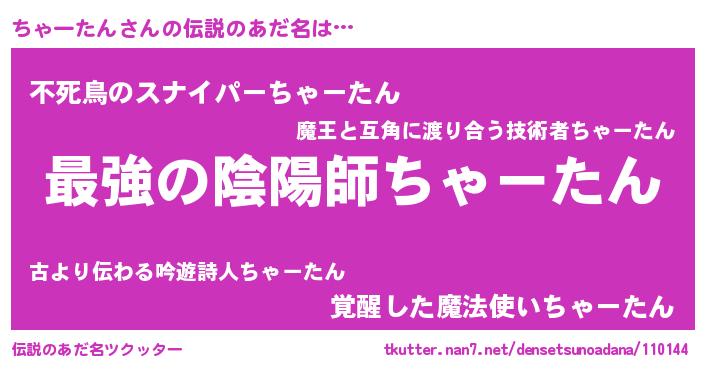 | 男性向けラノベタイトル風あだ名 | 『Re:ちゃーたんから始める異世界生活』 |
