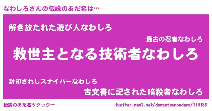 | 男性向けラノベタイトル風あだ名 | 『なわしろに滅ぼされるだけの簡単なお仕事です』 |