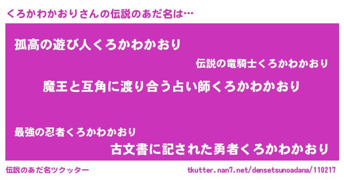 | 女子向けラノベタイトル風あだ名 | 『くろかわかおり恋絵巻』 |