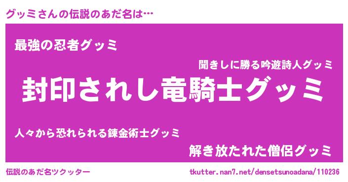 | 胡散臭い通販商品みたいなあだ名 | 『あなたにだけ特別に提供する100年もののヴィンテージワイン…その名も「グッミ」』 |