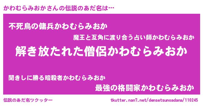 | 意味不明あだ名 | 『住所不定無職かわむらみおか(50歳)』 |