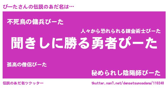 | 女子向けラノベタイトル風あだ名 | 『異世界で失敗しない100のぴーた』 |
