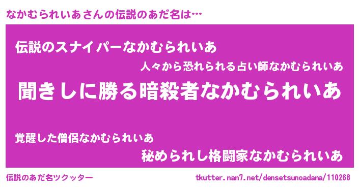 | 意味不明あだ名 | 『住所不定無職なかむられいあ(53歳)』 |