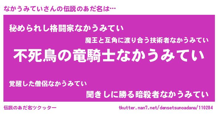 | 男性向けラノベタイトル風あだ名 | 『なかうみていに滅ぼされるだけの簡単なお仕事です』 |