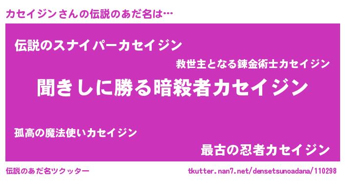 | 胡散臭い通販商品みたいなあだ名 | 『絶対に幸福をもたらす健康食品…その名も「カセイジン」』 |