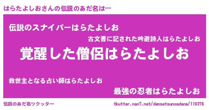 | 男性向けラノベタイトル風あだ名 | 『はらたよしおに滅ぼされるだけの簡単なお仕事です』 |