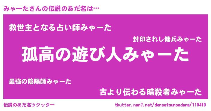 | 女子向けラノベタイトル風あだ名 | 『みゃーたなんてお断りですっ。』 |