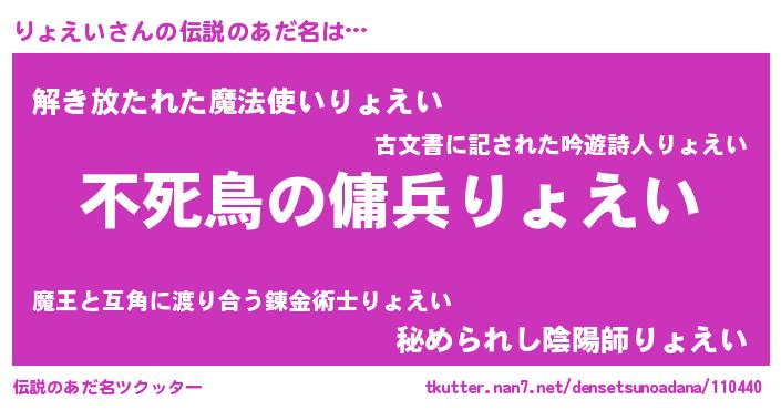 | 男性向けラノベタイトル風あだ名 | 『転生したらりょえいだった件』 |