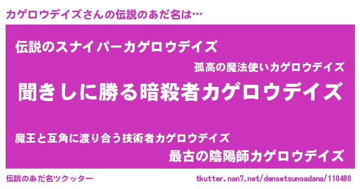 | ヒーロー風カッコイイあだ名 | 『ネオカゲロウデイズ』『黄金騎士カゲ』 |