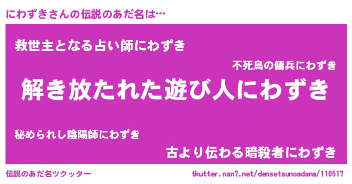 | 男性向けラノベタイトル風あだ名 | 『にわずきの嫁は女の子じゃないと思った?』 |