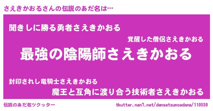 | 男性向けラノベタイトル風あだ名 | 『さえきかおる~年齢イコール彼女いない歴の魔法使い~』 |