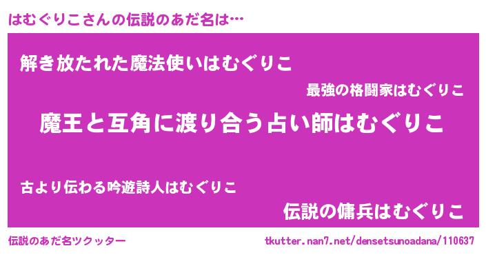 | 男性向けラノベタイトル風あだ名 | 『Re:はむぐりこから始める異世界生活』 |