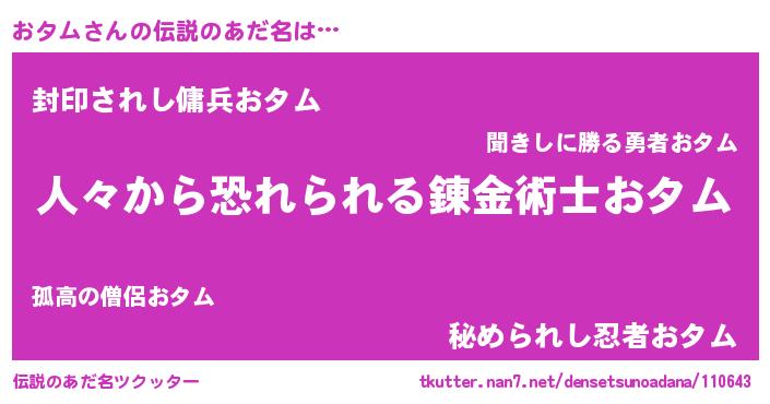| 女子向けラノベタイトル風あだ名 | 『おタム夫妻のなれそめ』 |