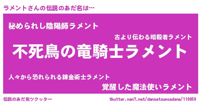 | 男性向けラノベタイトル風あだ名 | 『転生したらラメントだった件』 |