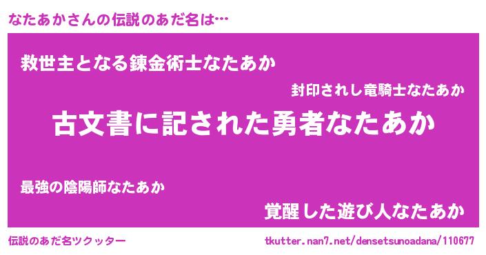 | ヘコむあだ名 | 『なたあか(遠い目)』『なたぷりん』 |