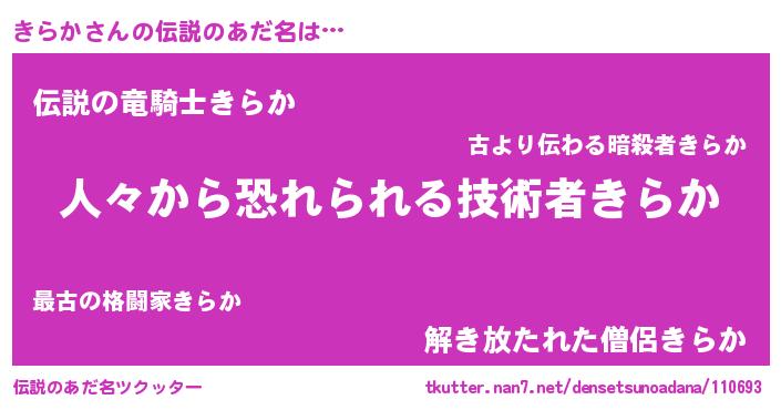 | ヒーロー風カッコイイあだ名 | 『超時空戦士キラカ』『友情の使者きらか』 |