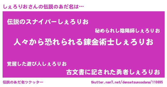 | 男性向けラノベタイトル風あだ名 | 『おまえをオタクにしてやるから、俺をしぇろりおにしてくれ! 』 |
