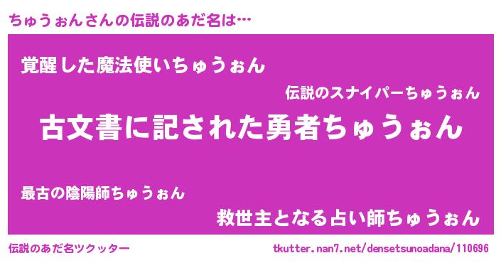 | ヒーロー風カッコイイあだ名 | 『ネオチュウォン』『暗黒騎士チュ』 |