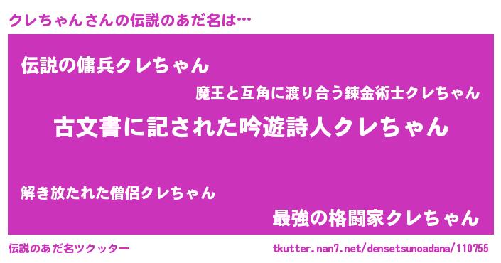 | 意味不明あだ名 | 『永久保存クレちゃん』『自称クレちゃん』 |