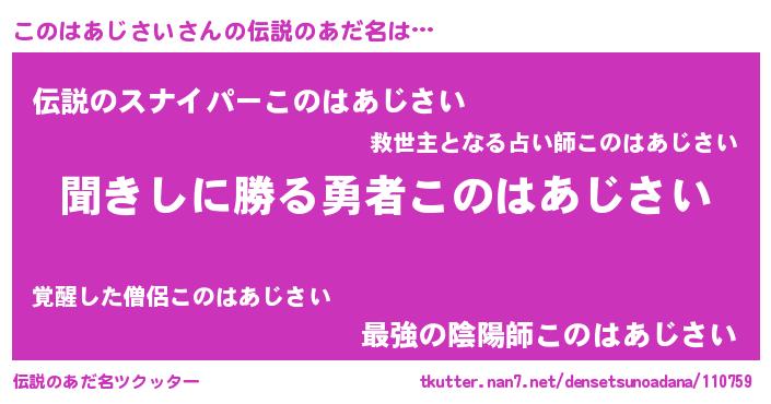 | 男性向けラノベタイトル風あだ名 | 『コノハアジサイスレイヤー』 |