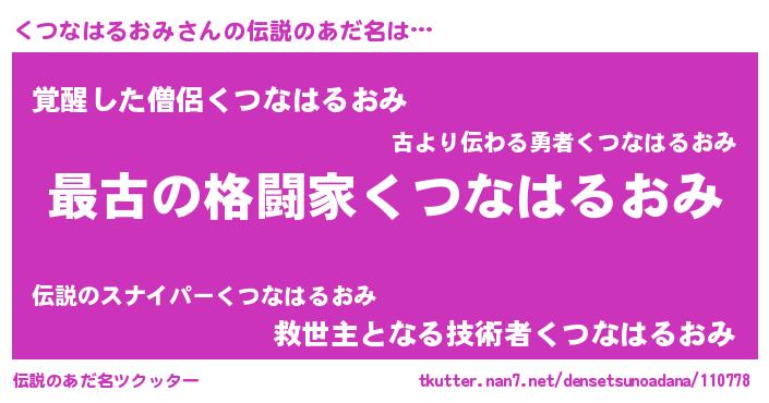 | 男性向けラノベタイトル風あだ名 | 『Re:くつなはるおみから始める異世界生活』 |