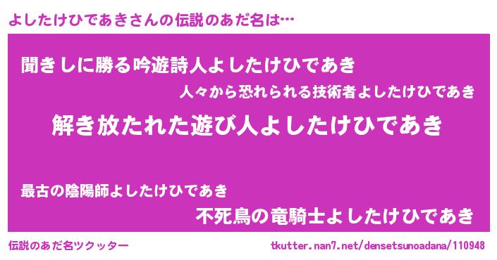 | ヘコむあだ名 | 『よしぷりん』『よしたけひであき(小並感)』 |