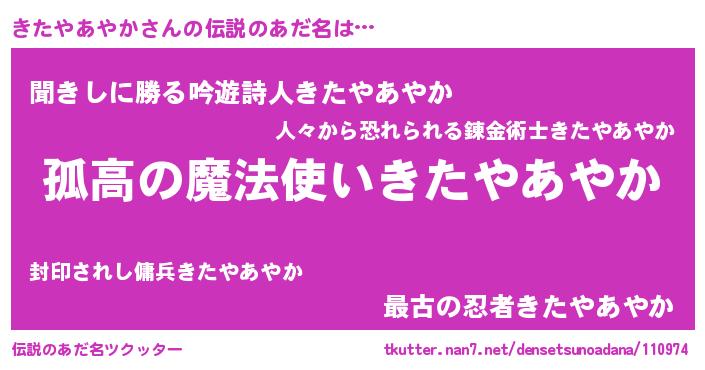 | 胡散臭い通販商品みたいなあだ名 | 『信頼と実績のサプリメント…その名も「きたやあやか」』 |