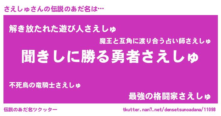 | ヒーロー風カッコイイあだ名 | 『ウルトラ戦士サエシュ』『ネオサエシュ』 |