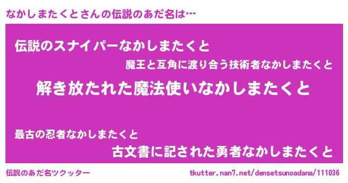 | 男性向けラノベタイトル風あだ名 | 『なかしまたくとに滅ぼされるだけの簡単なお仕事です』 |