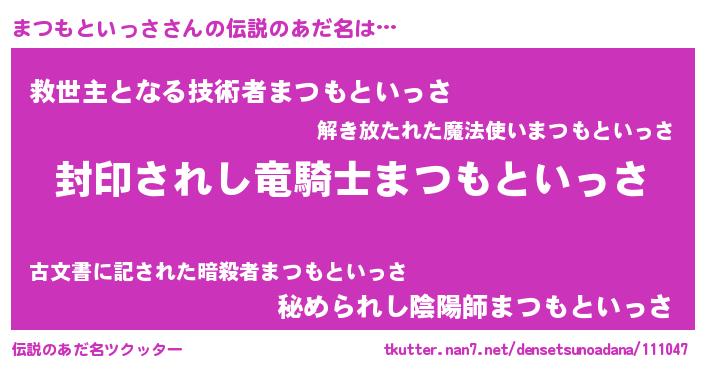 | 男性向けラノベタイトル風あだ名 | 『まつもといっさに滅ぼされるだけの簡単なお仕事です』 |